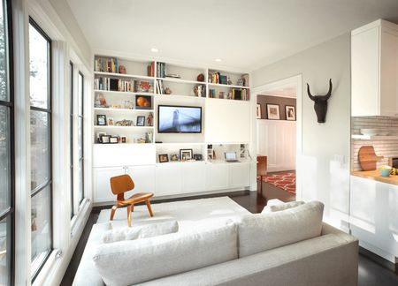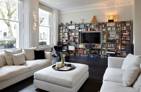 Не меньшей популярностью для установки систем хранения книг пользуется поверхность, на которой находится видео-зона. Открытые полки с книгами вокруг телевизора и смотрятся отлично и места много не занимают.