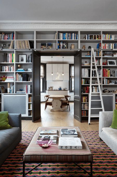 Книжный стеллаж в гостиной мгновенно прибавляет комнате статус домашней библиотеки. Для хранения книг удобно использовать стену с дверным проемом. Вокруг двери встраиваются (или используется переносная модель стеллажа) открытые полки или ячейки. Таким образом и проблема хранения решится, и полезное пространство гостиной будет использовано рационально.