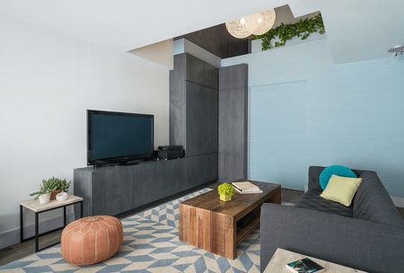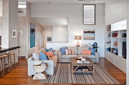 Для гостиной, расположенной в типовой квартире расположение мягкой зоны не у стены представить сложно из-за малых размеров комнаты. А вот в частных домах и апартаментах улучшенной планировки есть возможность импровизировать. При расположении дивана не у стены, можно оформить его заднюю стенку с помощью невысокого стеллажа. Таким образом и количество систем хранения в гостиной пополнится, и образ помещения будет интересным, нетривиальным.