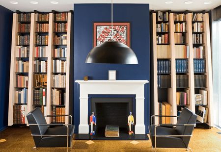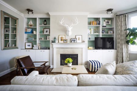 Для гостиной, в которой установлен камин (как правило, он располагается в центре одной из стен без окон), логично обустроить системы хранения по обе стороны от очага. Симметричное расположение открытых полок и распашных шкафчиков не только создаст вместительную систему хранения, но и привнесет в образ гостиной строгость, четкость и геометричность.