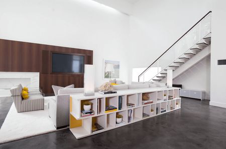 Белоснежные стеллажи от пола до потолка не выглядят массивными, несмотря на свои масштабы. Светлые тона придают массивной конструкции легкости, свежести.