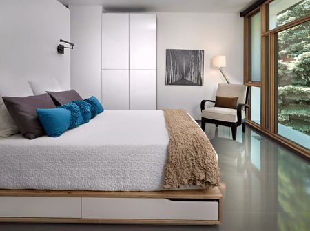 Практически в любой спальне устанавливается шкаф или целая гардеробная система для хранения одежды, белья и аксессуаров. Но чаще всего этих мер бывает недостаточно, ведь удобно было бы хранить здесь же, в комнате для сна и отдыха, дополнительные одеяла или пледы, смену постельного белья или подушки для оставшихся с ночевкой гостей. Все эти предметы могут поместиться в выдвижных ящиках, расположенных в нижней части кровати.