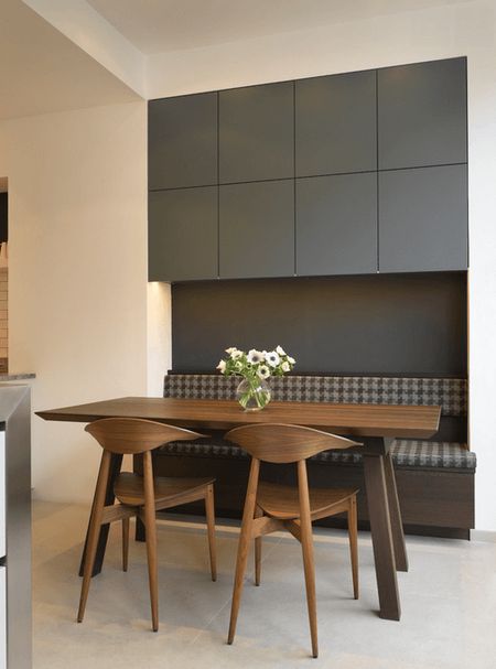 Многие могут сказать, что в пространстве кухни и так много систем хранения — целый мебельный гарнитур, да еще и во многих случаях кухонный остров в придачу. Но много мест для хранения не бывает. Перед вами вариант размещения дополнительных кухонных шкафчиков под самым потолком над обеденной зоной. Абсолютно гладкие фасады шкафов не привлекают внимания, смотрятся современно и стильно, но при этом выступают в качестве практичного решения для хранения кухонной утвари.