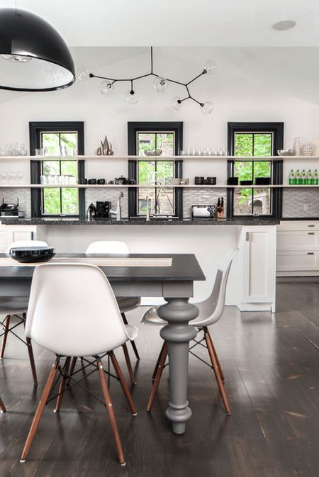 В кухонном пространстве, где нет возможности навесить достаточное количество шкафов верхнего яруса из-за большого количества окон или их размеров, можно использовать в качестве альтернативы открытые полочки. Таким образом и помещение будет наполнено солнечным светом, и посуда будет размещена что называется «под рукой».