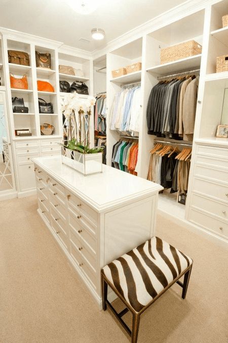 В просторной гардеробной помимо шкафов вдоль стен часто устанавливается остров – отдельно стоящий мебельный блок, который эффектно сочетает функции системы хранения и подставки. Как правило, гардеробный остров представляет собой вместительный комод с множеством выдвижных ящиков для хранения аксессуаров, украшений и прочих дополнений к образу.