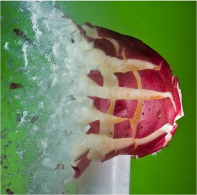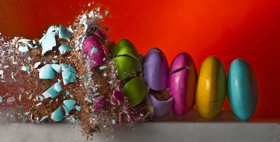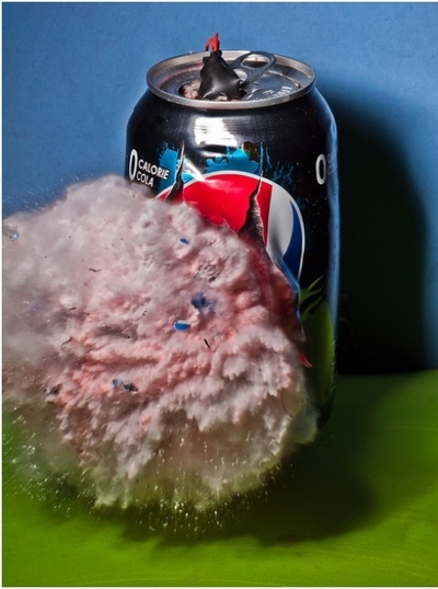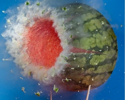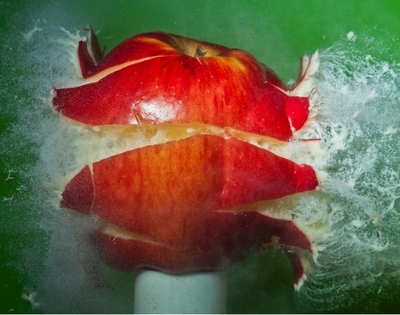 Поймать это мгновение Алану удается с помощью лазерного луча, вспышка которого позволяет, как бы остановить момент на одну миллионную часть секунды до взрыва. Применив один из способов моментальной фотографии, он сумел сфотографировать взрывы помидора, грецкого ореха, цветных карандашей и пр.